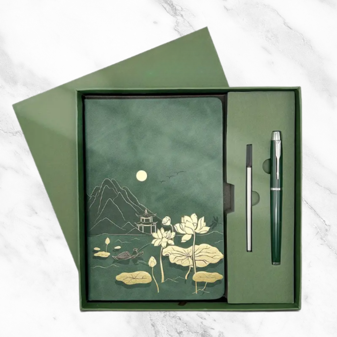 Die Landscape & Lotus Leaf Design SchenkBox ist ein stilvolles Geschenkset, das Tradition, Ästhetik und Inspiration vereint – perfekt für Geburtstage, Jubiläen, als Dankeschön oder einfach, um jemandem eine Freude zu machen. ✨